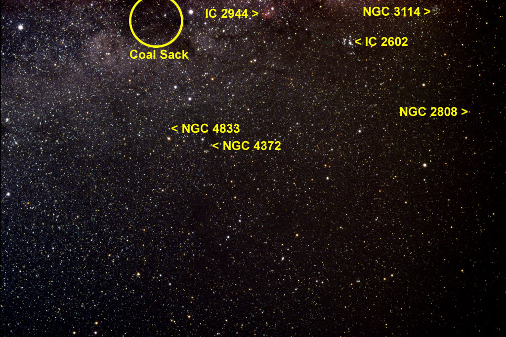 Das mit dem bloßen Auge sichtbare Band der Milchstraße erreicht in Musca seine südlichste Position. Viele interessante Deep-Sky Objekte befinden sich dort. Dunkle Wolken und Filamente interstellaren Staubes durchziehen das Feld von der Milchstraße bis in Chamaeleon hinein.