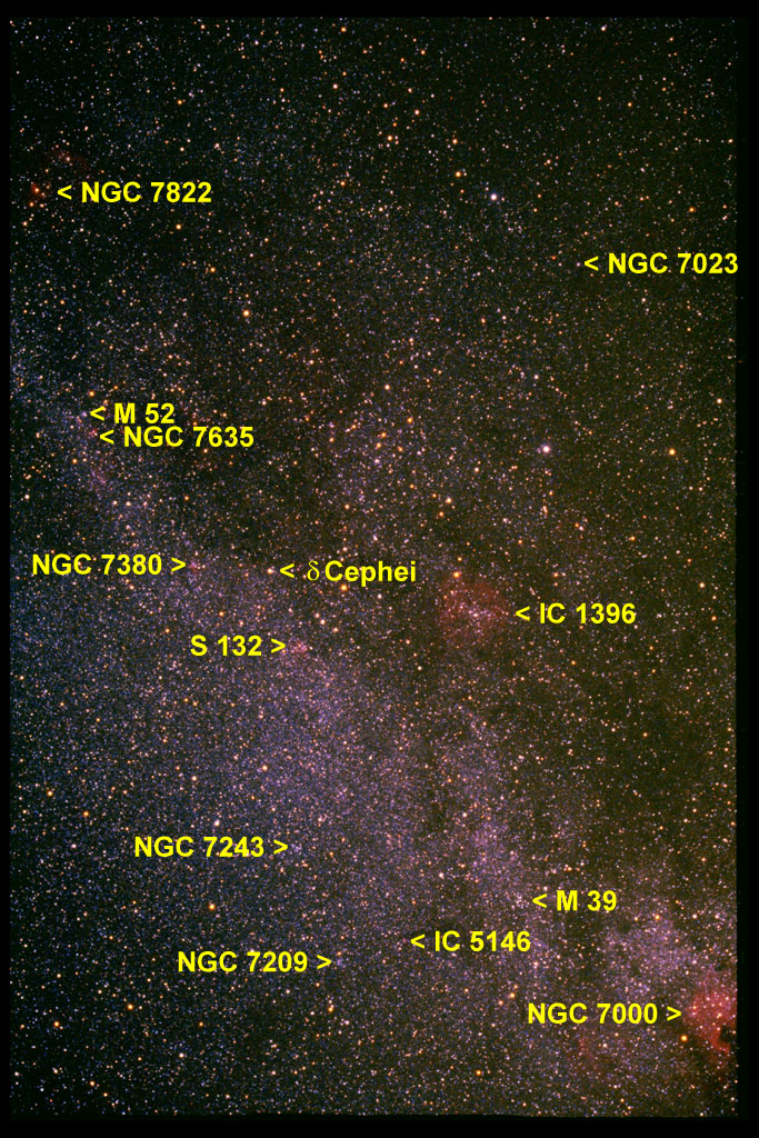 The constellation Cepheus is shown in the upper part of the image and Lacerta below (see lines). In the lower right are parts of Cygnus.