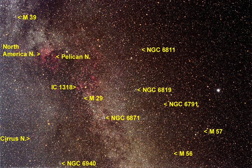 Im gezeigten Gebiet erreicht die nördliche Milchstrasse ihre grösste Helligkeit. Dichte Sternfelder sind durchzogen von dunklen Bereichen interstellarer dunkler Materie. Besonders auffällig ist die sogenannte grosse Cygnus Teilung. Ein breites Band, in dem interstellarer Staub unseres lokalen Spiralarms das Licht der dahinter liegenden Sterne verschluckt, teilt die Milchstrasse scheinbar in zwei parallele Bereiche. Sehr viele galaktische Deep-Sky Objekte befinden sich in dieser Region. Am bekanntesten ist der sogenannte Nordamerika-Nebel in der linken oberen Bildhälfte.