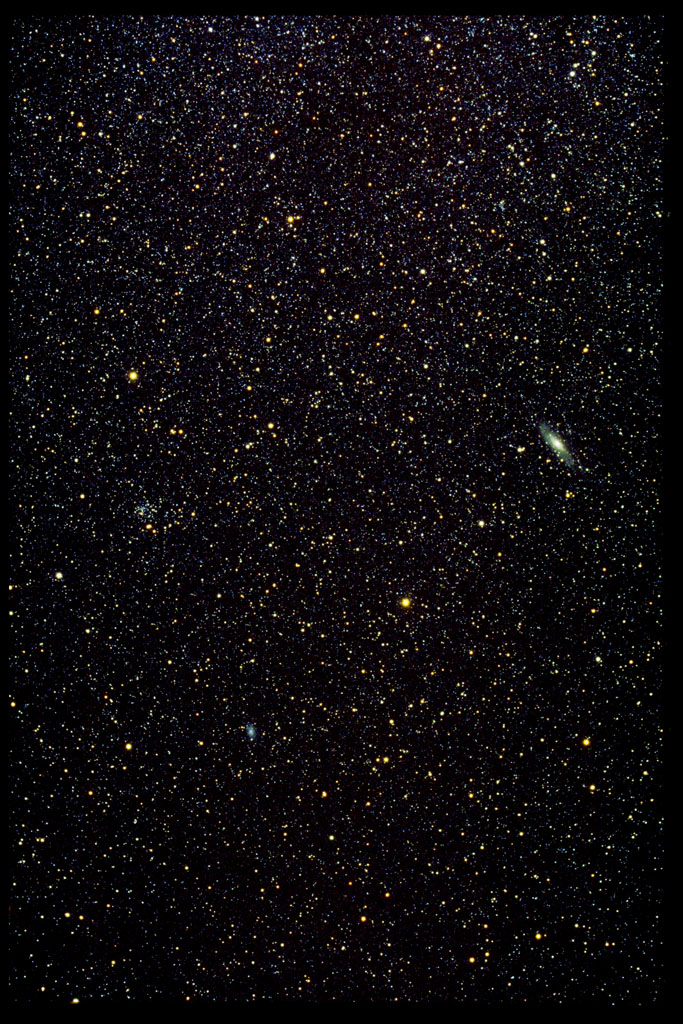 In mid-november Andromeda culminates at about 21:30 h local time (see lines). For observers at geographic latitude 40o north it goes right through the zenith. The position is about twenty degrees below the galactic plane, you can recognize the increasing star density to the upper right. So there are not many galactic deep sky objects, with the exception of the open cluster NGC 752 visible on the left hand side. But Andromeda is famous for the extragalactic M 31, the so called Andromeda Nebula, which is a very similar spiral galaxy to our own Galaxy. Also visible in the photography is the face on spiral galaxy M 33, which already belongs to the constellation Triangulum.