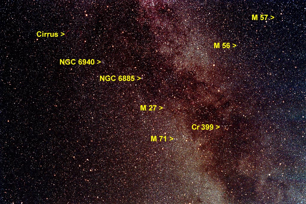 The milky way is quite prominent in the shown field. A dark band, called the "Great Rift", apparently divides the galaxy into two parts and continues from Cygnus through the shown field further south to Aquila and finally gets lost in Ophiuchus. It's a huge lane of dark interstellar dust that obscures the light of milky way's star population behind. Many galactic deep sky objects join the above field. Well known is the "Dumbbell Nebula" M 27 in Vulpecula, probably the finest Planetary Nebula for small telescopes. The curious star group Cr 399, called the "Coathanger Cluster", is already visible in small binoculars.