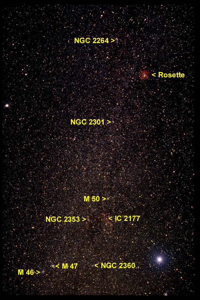 El ecuador galáctico cruza el campo visual de norte a sur, ofreciéndonos un part de objetos de cielo profundo interesantes. El más famoso es la nebulosa Rosetta (el objeto de color rojo visible arriba a la derecha). Se trata de una amplia región aproximadamente circular de HII que contiene un cúmulo estelar abierto relativamente joven que ioniza el gas circundante con su radiación UV de alta energía. En la parte superior se pueden identificar otros dos cúmulos abiertos.