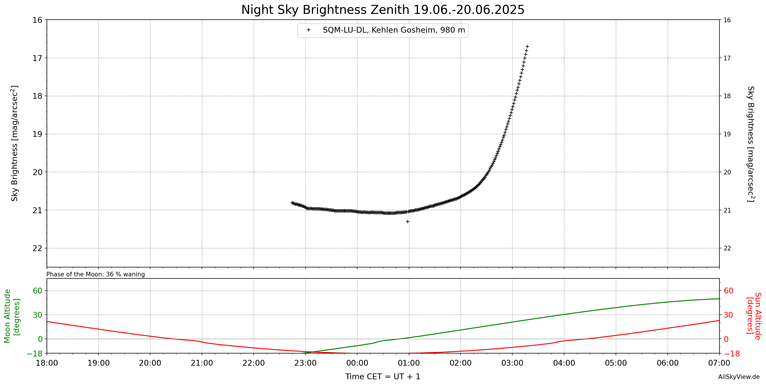 The brightness in the zenith was 21.00 mag/arcsec² at the time of the above photography, 23:28 CET, 19.06.2025.